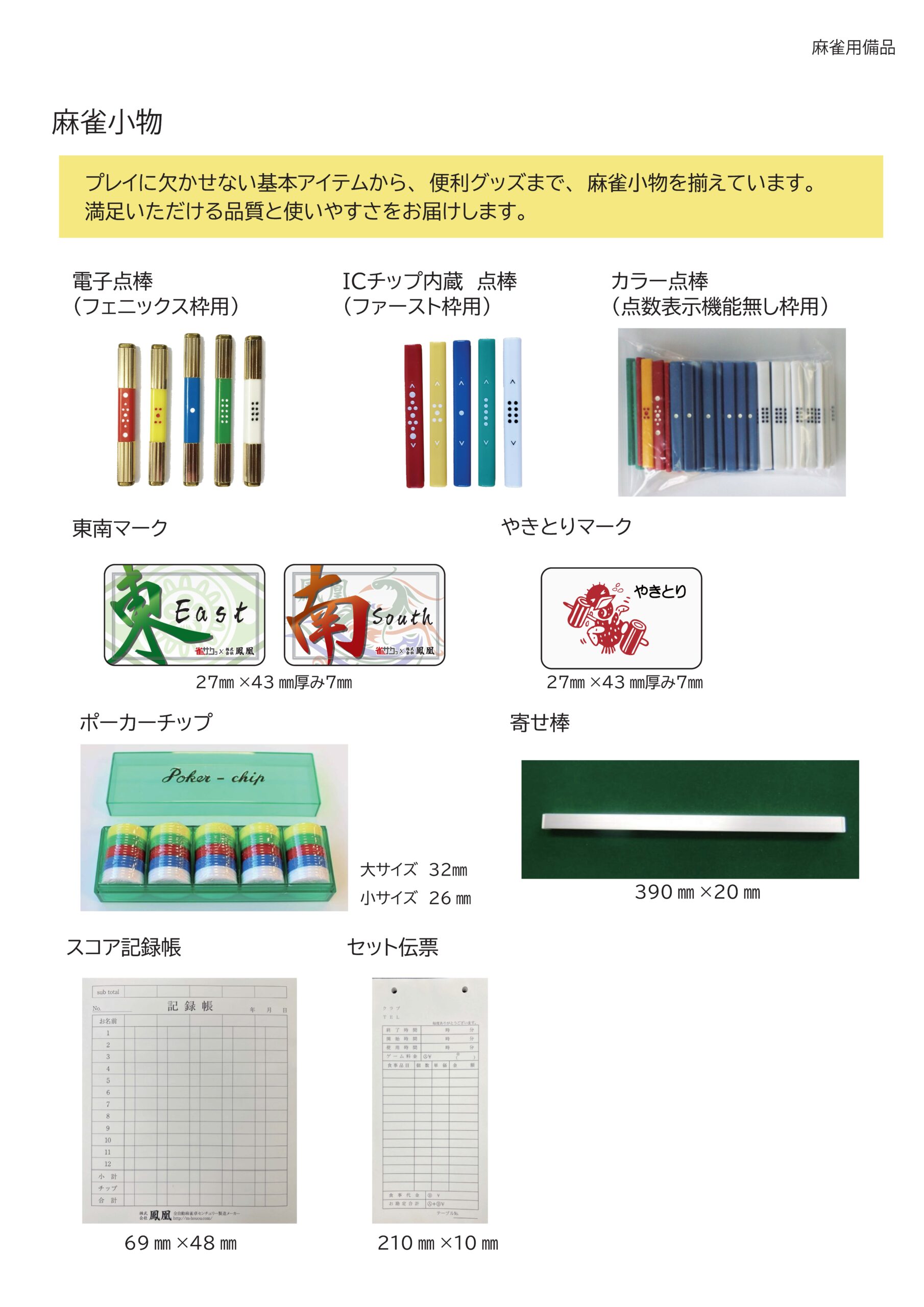 麻雀卓用のマットや牌などの必需品や店舗にあれば便利な物。販促用グッズなど